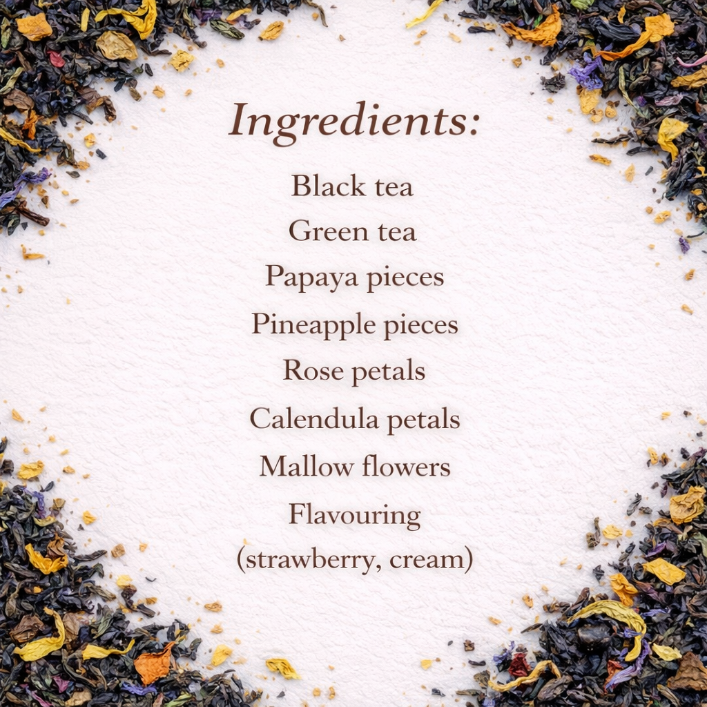 Ingredients: Black tea, green tea, papaya pieces (papaya, sugar), pineapple pieces (pineapple, sugar, citric acid), rose petals, calendula petals, mallow flowers, flavouring (strawberry, cream).